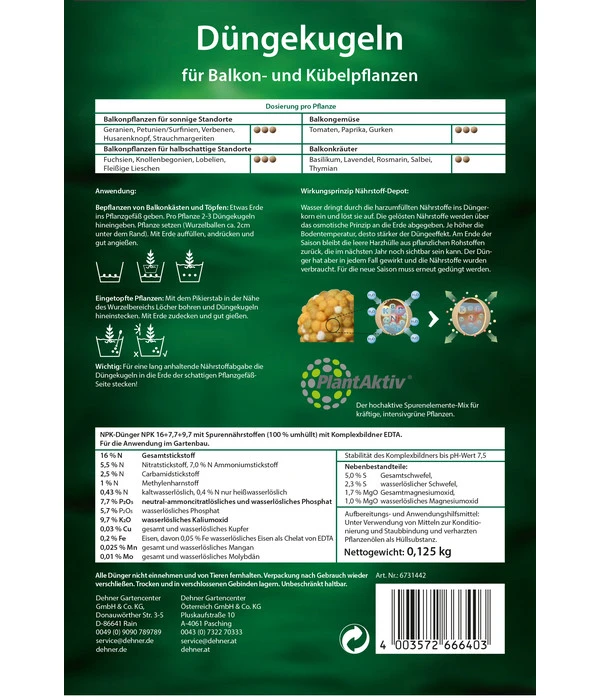 Jede Pflanze braucht für ihre gesunde Entwicklung genügend Nährstoffe, vor allem Stickstoff, Phosphor und Kalium. Diese hochwertigen Nährstoffe sind, ergänzt um wichtige Spurenelemente, in den Dehner Düngekugeln enthalten, und zwar in genau der Mischung, die Ihre Balkon- und Kübelpflanzen brauchen.