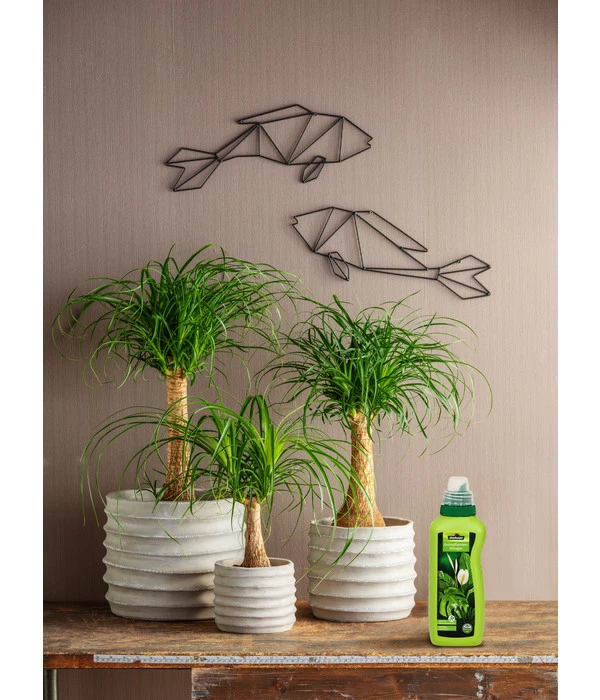 Ficus und Yucca, Drachenbaum und Birkenfeige, Elefantenfuß und Palme – Grünpflanzen in Wohnräumen sind dekorative Accessoires und schaffen eine Atmosphäre, in der man sich gleich wohl fühlt. Mit ihrem schönen Blattwerk bringen sie die Natur ins Haus und sorgen für ein besseres Raumklima. Damit Ihre grünen Mitbewohner gesund bleiben und gut gedeihen, sollten Sie ihnen von Anfang an und regelmäßig das richtige ‚Kraftfutter‘ geben. Zum Beispiel den Dehner Grünpflanzen-Dünger. Der Dehner Grünpflanzen-Dünger ist ein Universaldünger für alle Grünpflanzen im Zimmer, im Wintergarten und auf dem Balkon. Sie können diesen Dünger sogar für Palmen verwenden, was das Handling für Sie einfacher macht, wenn Sie einen Mix verschiedenster Pflanzen um sich geschart haben. Der klassische NPK-Dünger mit einer Mixtur von 8+3+6 plus Spurennährstoffe bewirkt ein kräftiges Wachstum sowie eine intensive Farbgebung. Gleichzeitig stärkt der Dehner Grünpflanzen-Dünger die Widerstandskraft der Zimmerpflanzen gegen Krankheiten und Schädlinge.