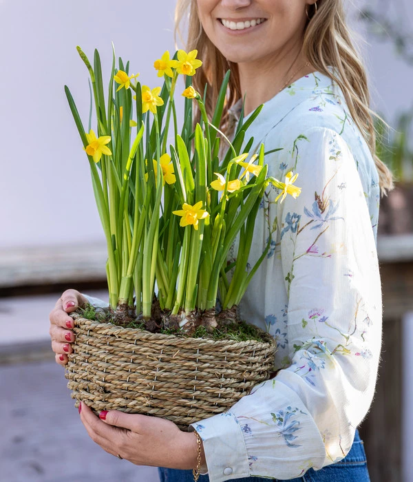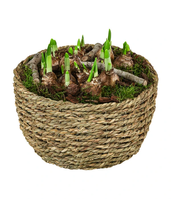 Der Frühling ist die Zeit der bunten Blumen, summenden Insekten und vor allem der guten Laune, wenn sich endlich die Sonne wieder zeigt. Was also könnte das Frühjahr besser repräsentieren als ein ganzer Korb voller Narzissen? Die strahlenden Blütenschönheiten gehören zu den beliebten Klassikern der Frühlings- und Osterdekoration und Sie können Sie jetzt ganz einfach in diesem schönen Seilkorb mit nach Hause nehmen. Eingepflanzt wurden hier ‚Tête à Tête‘ Narzissen, deren sonnengelbe Blüten vom ländlichen Charme des Korbes unterstrichen werden. Abgerundet wird das Arrangement mit Moos und Rinde als Abdeckung im Korb. So haben Sie direkt die perfekte Dekoration, ganz ohne lästiges Aussuchen, Einpflanzen und Dekorieren.