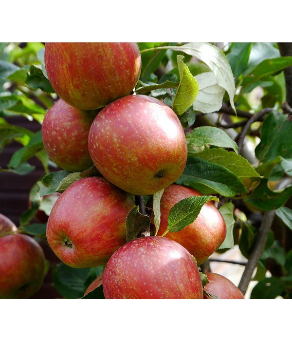 Eine besondere Form der Züchtung ist das Säulenobst. Diese Bäume haben den Vorteil, dass sie nicht nur für kleine Gärten, sondern auch für größere Kübel auf Balkon oder Terrasse geeignet sind. Sie erreichen eine Höhe von max. 3 Metern und werden ausgewachsen ca. 60 cm breit. Die Seitentriebe sollten Sie jedoch regelmäßig entfernen, bzw. auf ca. 3 – 5 cm stutzen. Der Säulenapfel ‚Starcats‘ bildet große, festfleischige Früchte mit dunkelroter Schale. Die knackigen, saftigen Früchte der Gartenpflanze haben einen sehr guten Geschmack und ein süßsäuerliches Aroma, ähnlich wie Elstar. Zudem ist die Pflanze resistent gegen verschiedene Apfelkrankheiten, wie Schorf, Krebs oder auch Blattläuse.