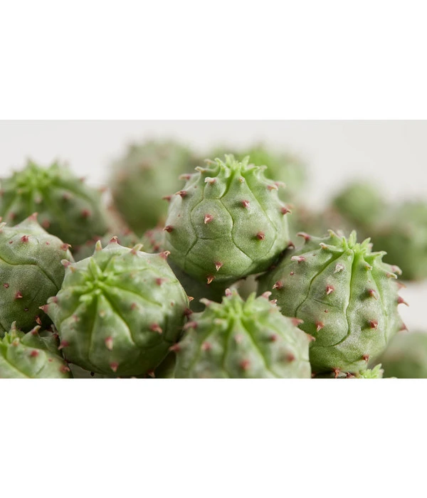 Die Familie der Wolfsmilchgewächse, die über 2000 Mitglieder zählt, ist bekannt für ihre extrem unterschiedlichen Wuchsformen. Die Bandbreite reicht von urigen Wüstenkakteen bis zu dem beliebten Weihnachtsstern, mit dem Sie zur Weihnachtszeit Ihre Wohnung schmücken. Diese Ungewöhnliche Wolfsmilch aber ist einer der interessantesten Vertreter der Familie. Sehen sie nicht eigenartig aus, diese kleinen kugelförmigen Knubbel, die sich dicht an dicht drängen, als würden sie wissen, dass sie als Gruppe besonders attraktiv wirken? Ihre Heimat hat die Ungewöhnliche Wolfsmilch in Madagaskar und Südafrika, wo sie als niedriger Halbstrauch nah am Boden wächst. Die “Äste“ sind kugelige Triebe, deren Oberfläche in 6-eckige Warzen unterteilt ist. Auf diesen bilden sich winzige Blätter, die aber schnell abfallen. Und fesselt Sie schon dieser Anblick, so werden Sie vollends begeistert sein, wenn die Ungewöhnliche Wolfsmilch ihre Blütenstände ausbildet, die an exotischer Extravaganz kaum zu überbieten sind. Holen Sie sich gleich die Ungewöhnliche Wolfsmilch und lassen Sie sich überraschen!