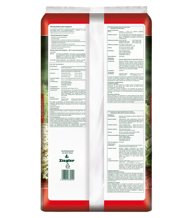 Eine tolle Möglichkeit Ihrer Gartengestaltung eine besondere Note zu geben: Ziegler Plantop Rindendekor ist nützlich und schön. Der Nutzen besteht darin, den Boden vor Erosion, Verschlämmung, Frost etc. zu schützen und Ihre Fläche dekorativ zu gestalten. Die Körnung von 10 – 40 mm ist ideal für die Ausbringung geeignet. Die Besonderheit des Rindendekors ist jedoch seine ziegelrote Farbe – Sie können den Mulch bei Ihrer Gartengestaltung also auch zur farblichen Auflockerung, zur optischen Ergänzung von Grünpflanzen etc. einsetzen.