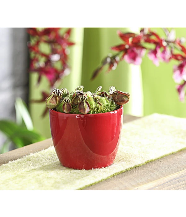 Am wohlsten fühlt sich der Zwergkrug an einem hellen, sonnigen bis halbschattigen Platz. Sie sollten der sehr langsam wachsenden Pflanze gleich von Anfang an einen recht großen Topf gönnen, denn sie reagiert sehr unwillig auf Umtopfen. Wichtig ist, dass das Substrat sehr luftig und locker ist. Gießen Sie den Zwergkrug nur mit Regenwasser oder destilliertem Wasser, das zimmerwarm sein sollte, und achten Sie darauf, dass der Boden ständig feucht ist, vermeiden Sie aber Staunässe. Vorsicht beim Gießen: Nie in die Krüge gießen. Auf Düngegaben können Sie komplett verzichten. Im Sommer liebt es Cephalotus warm, am besten so um 25°C, für seine Winterpause darf es ruhig etwas kühler sein, so zwischen 10-15°C.